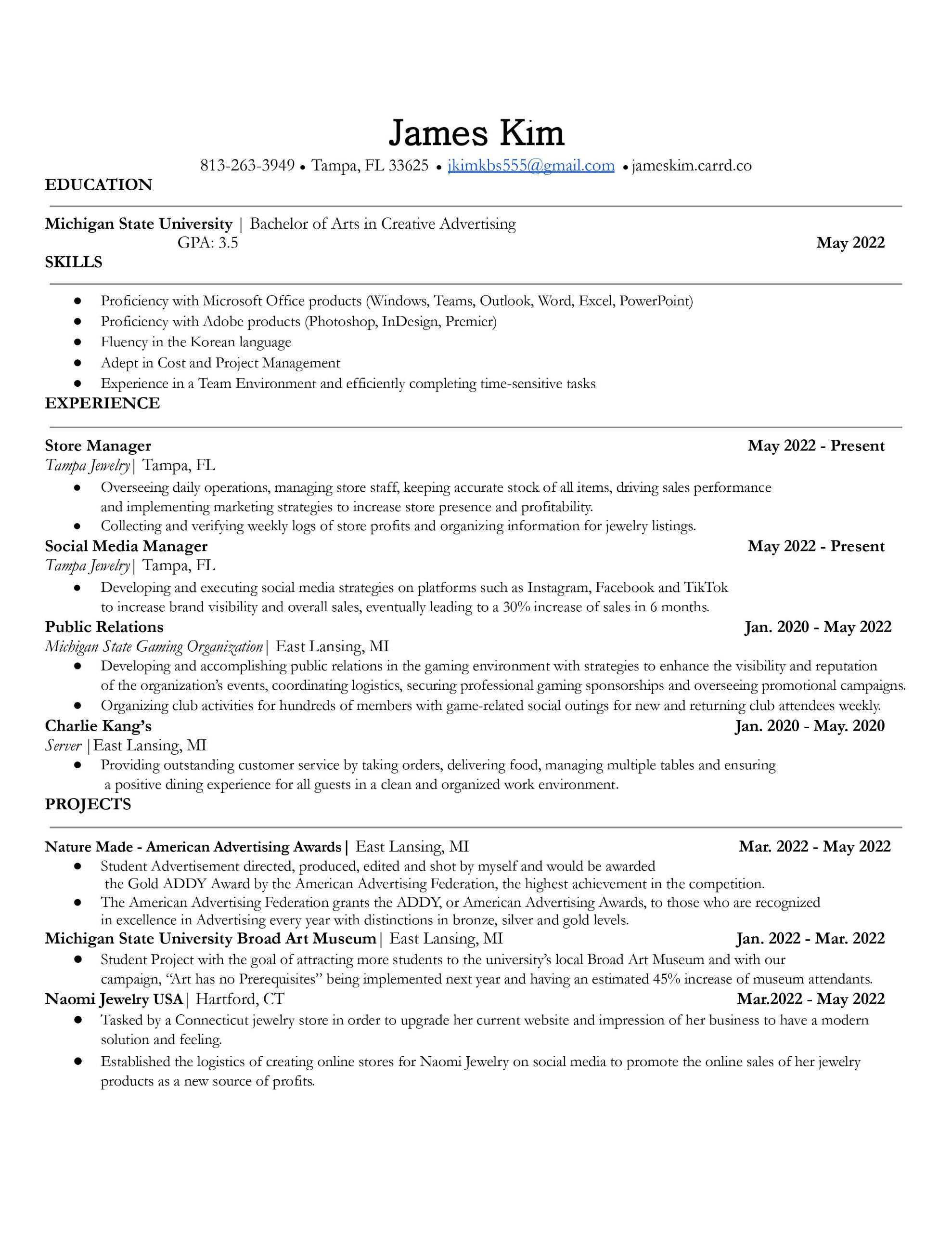 Hello, My names is James Kim, a recent graduate from Michigan State University. I am an Advertising Creative Major and working towards in achieving a degree in the field. I am originally from Canada, but have spent most of my life in Tampa, Florida. I am on a mission to make my mark of creativity in this dull world and hope to make my experiences.Love For all things Design, Art and Film.